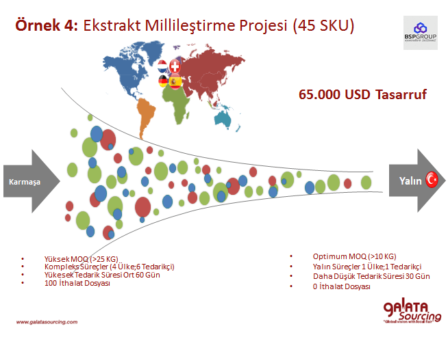 Bir başka sevdiğim model milleştirme modeli, keşke özellikle teknoloji ve hammadde alanında ülkemiz daha rekabetçi daha güçlü olsa da bu modelden örnekleri çoğaltabilesek. Bu örneğimizde aslında tasarruftan daha da güzel bir çıktımız var aslında, hikayeyi başa saracak olursak henüz çiçeği burnumda bir kaç girişimci bir araya gelerek ülkemizin en fazla ithal ettiği ürünlerin analizini yapıyorlar daha sonra giriş bariyeri düşük ancak görece rekabetin az olduğu alanları inceliyorlar ve ekstrakt alanını kendilerine hedef alan olarak belirliyorlar. Daha sonrasında başlıyorlar potansiyel müşterilerinin kapısını çalmaya, çoğu kapı onlara hiç açılmıyor çünkü konfor alanının sıcak alanına kapılmış, yanlış yapmaktan korkan ya da operasyonel yüklerin altında ezilip onlara görüşme zamanı ayarlayamayan insalarla dolu çoğu yer. Neyse ki şanslılar bize rastladırlar, biz de onlara güvendik, kalite denetimleri, bir takım iyileştirmeler, geliştirmeler sonucunda birlikte çok büyük bir projeye imza attık. Bu projenin çıktıları hem operasyonel mükemmellik hem ciddi tasarruf hem de milli bir üreticinin doğmasına sebebiyet verdi.