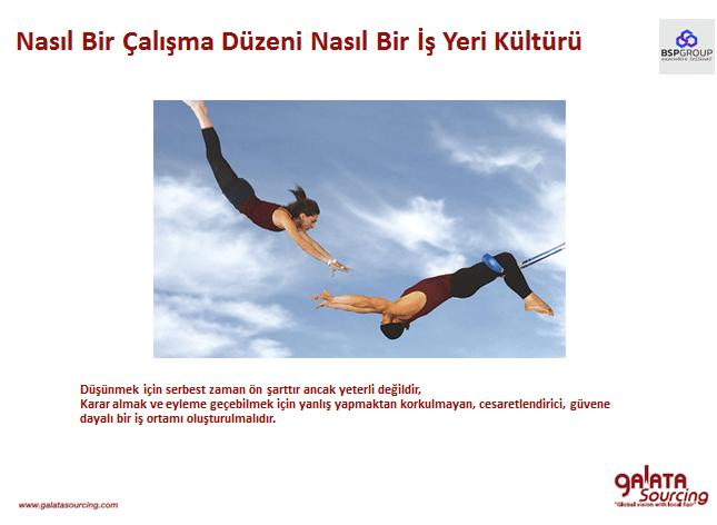 Bu slayt ile başlayan ve devam eden üç slaytta vermek istediğim mesaj çok net, eğer insanlar çarkların arasında eziliyorlarsa, kendilerini güvende hissetmiyorlarsa, her gün kaldıramayacakları çoklukta rütin katmadeğersiz işlerde boğuluyorlarsa onlardan iyileştirme ya da tasarruf projeleri çıkartmalarını beklemek hayalcilik olur.